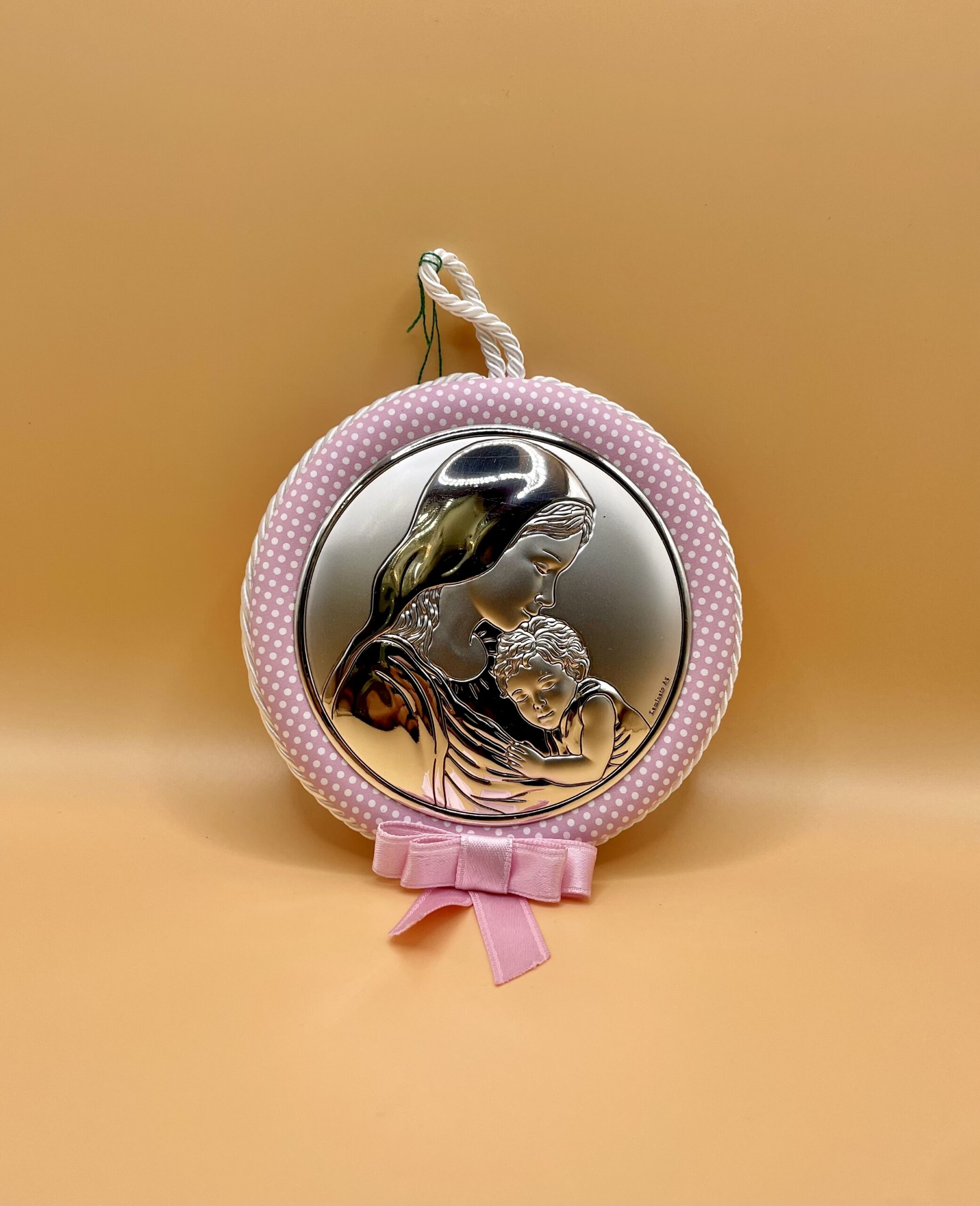 Grazioso Accessorio per Culla in stoffa, impreziosito da inserto in argento 925 con disegno Madonna con Bambino.