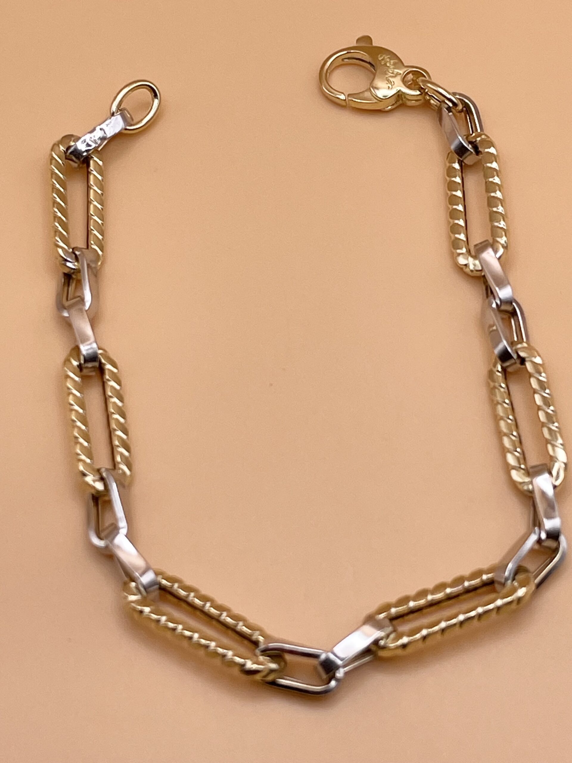 Elegante Bracciale Bicolore in Oro Giallo e Bianco 18kt, maglia ad anelli ovali intrecciati con separè in oro Bianco.