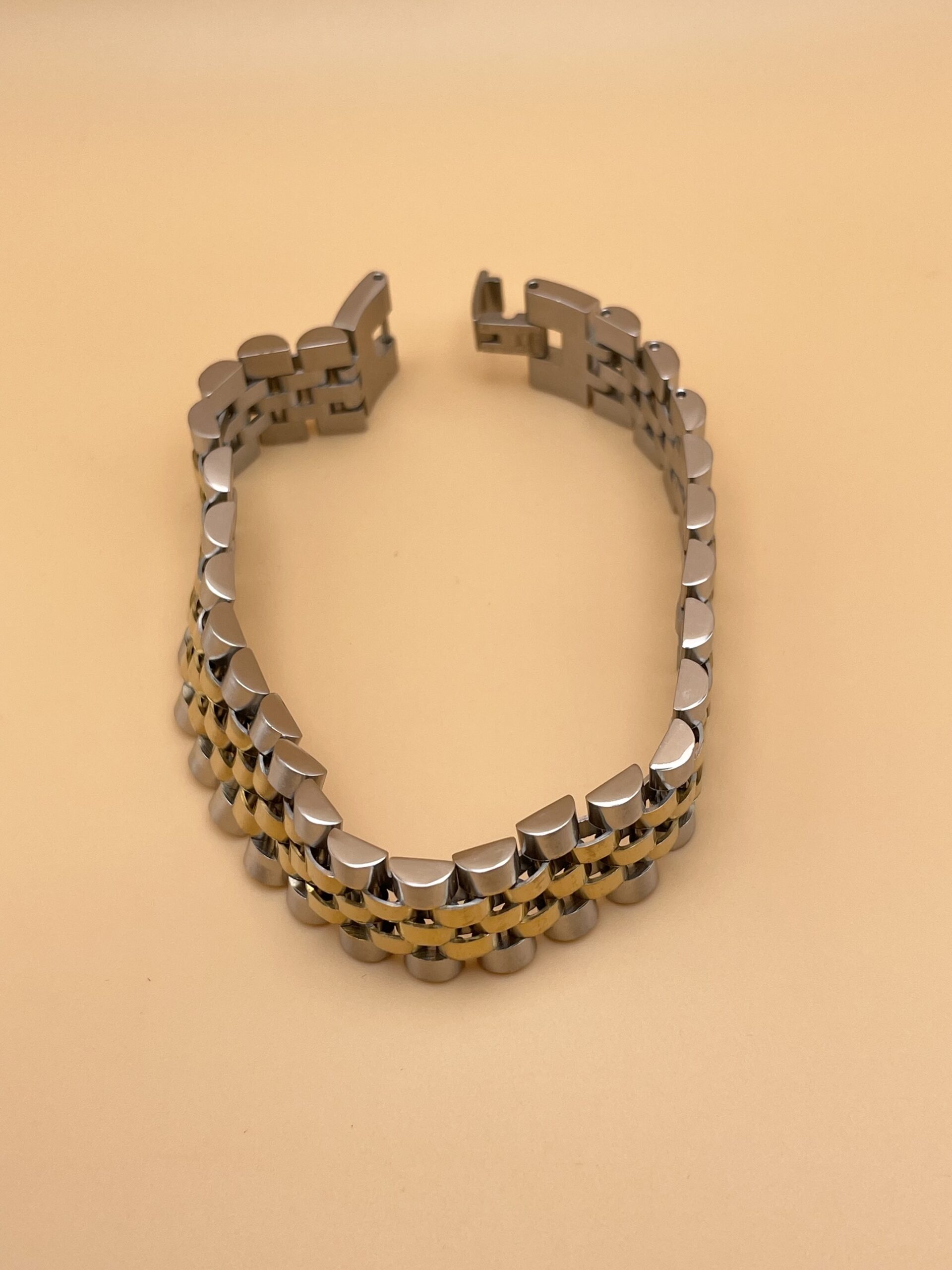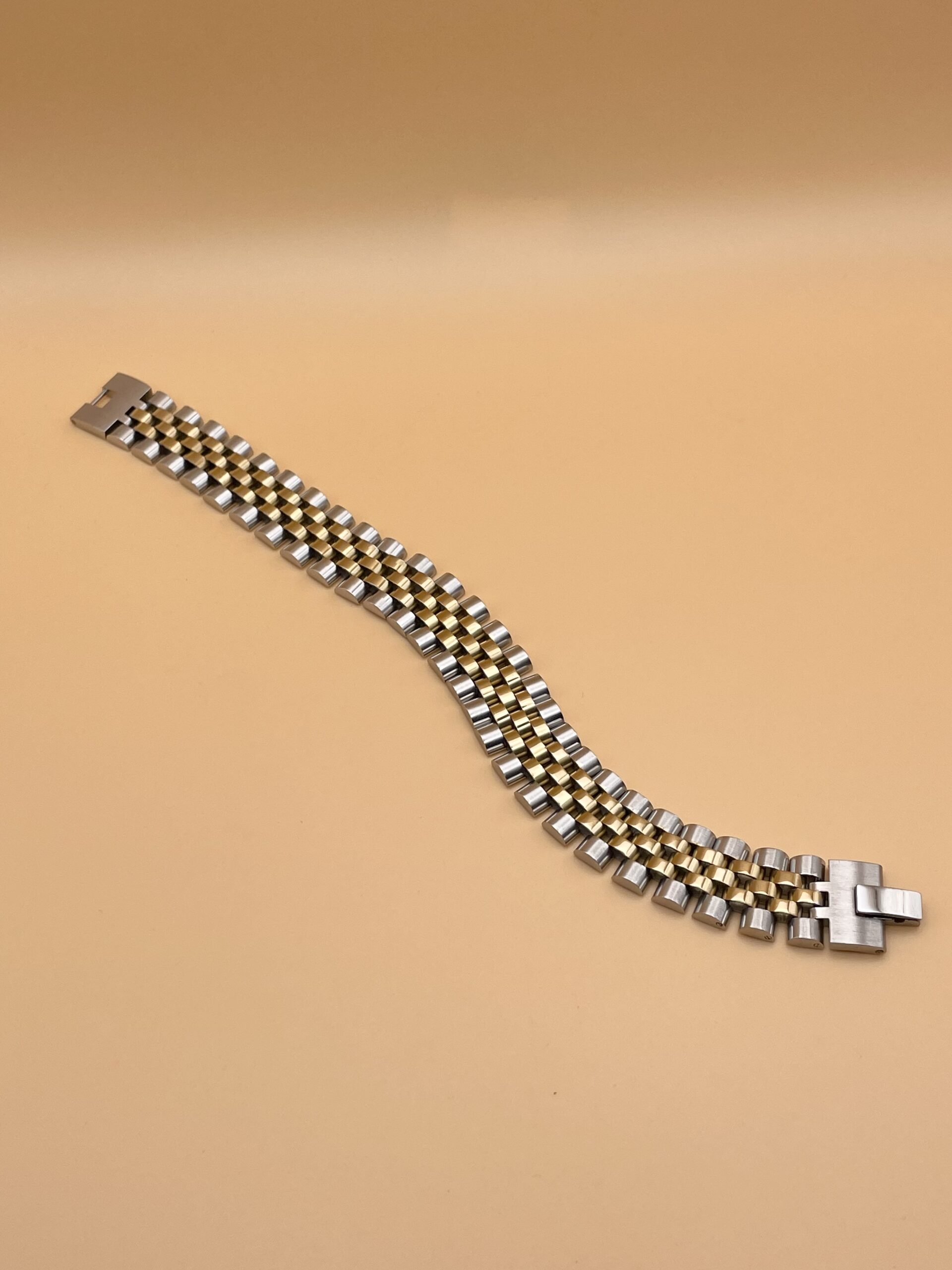Robusto braccialetto in acciaio anallergico, stile jubilee, bicolore argento e oro, misura media.