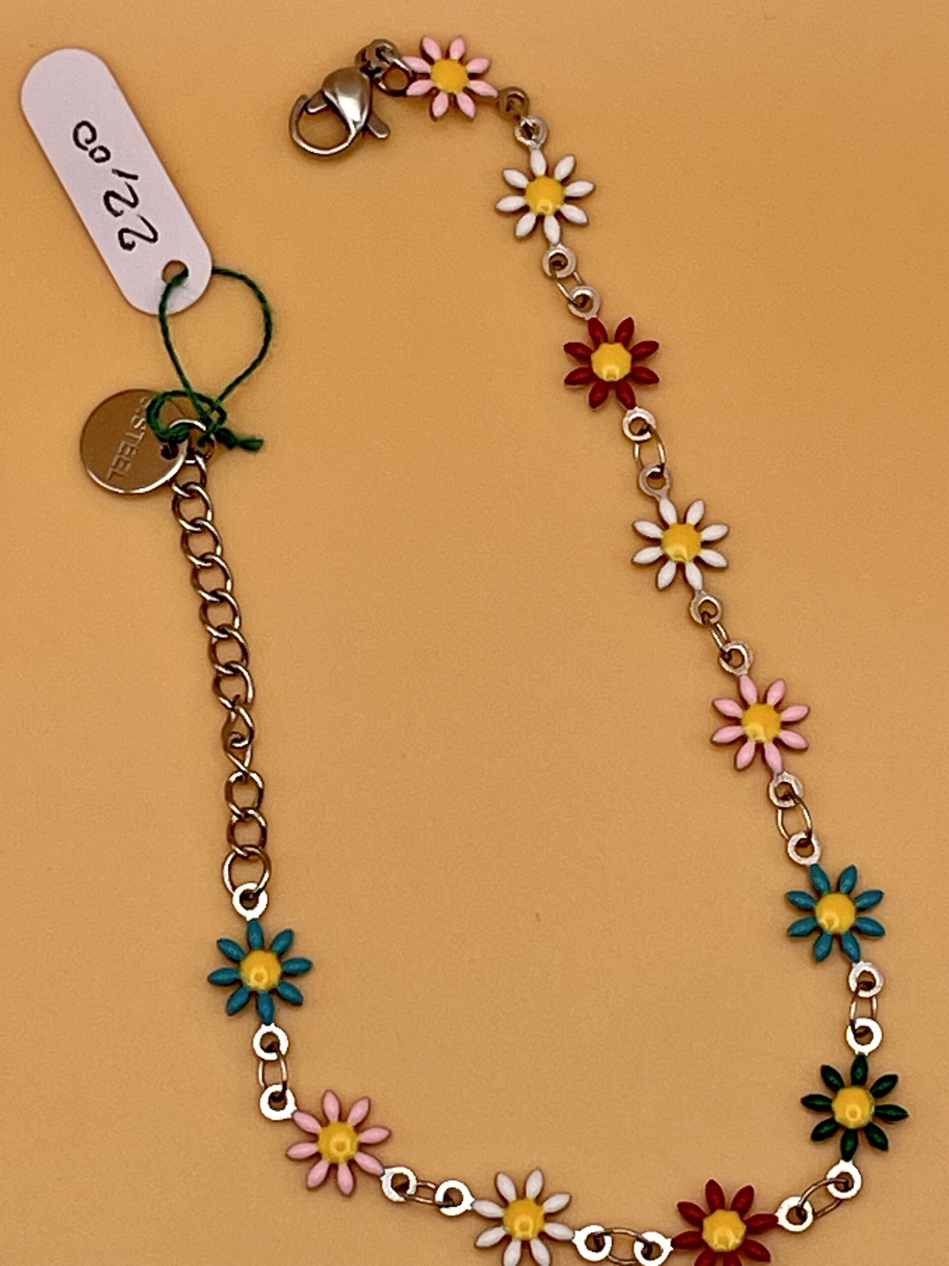 Braccialetto acciaio anallergico con fiorellini smaltati multicolore, dotato di chiusura regolabile con anellini e moschettone.