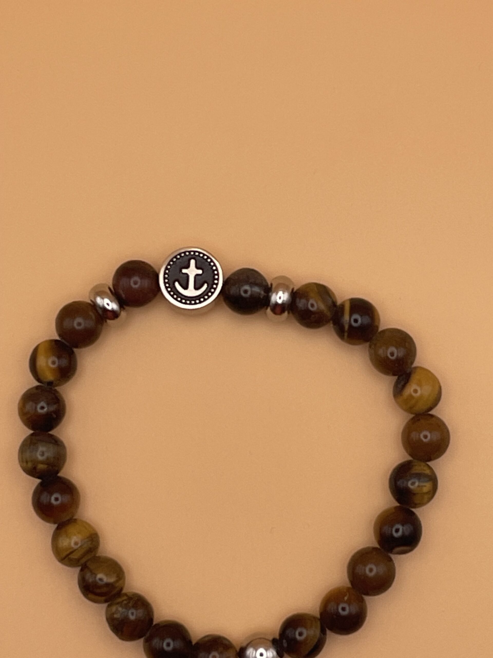 Robusto braccialetto in acciaio anallergico con perle color legno, stile marinara, decorazione ancora