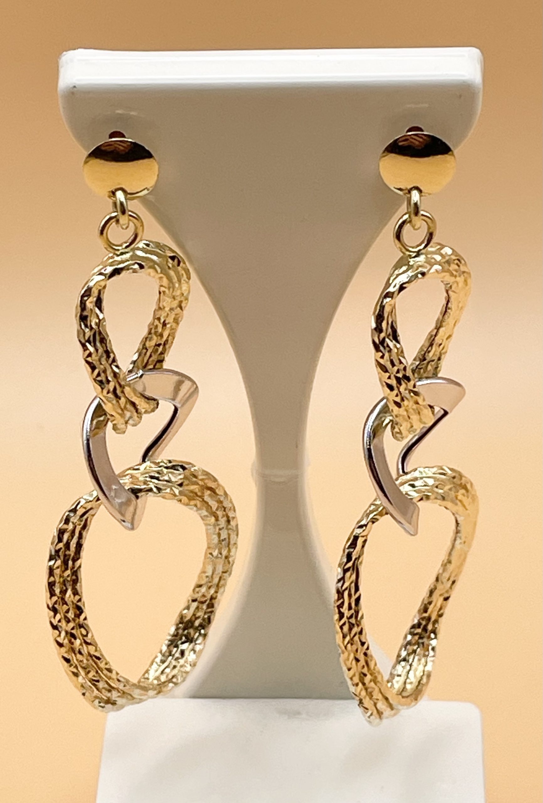 Splendidi orecchini a pendente in oro giallo e Bianco 18 carati, intrecciati con lavorazione Lucida e Martellata.