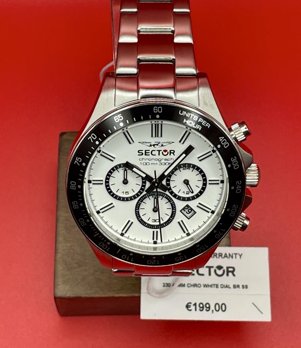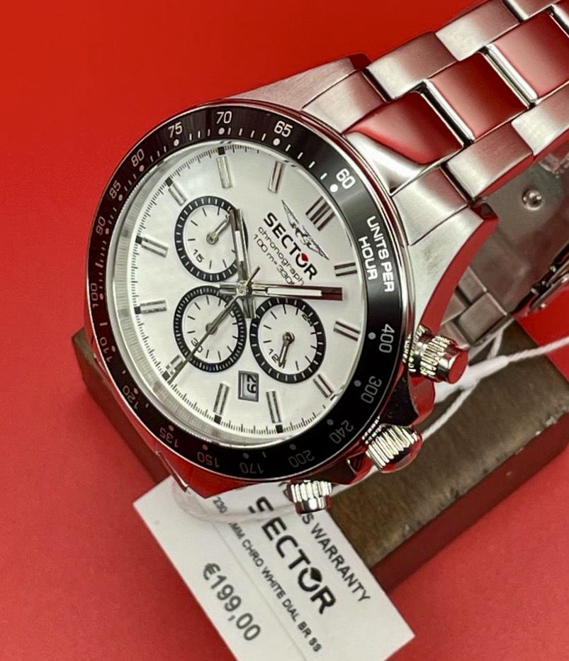 Cronografo Sector Sportivo, cassa in acciaio con lunetta tachimetrica nera, vetro minerale antigraffio. Elegante quadrante bianco con indici e data ad ore 5. Con robusto bracciale Oyster in acciaio.