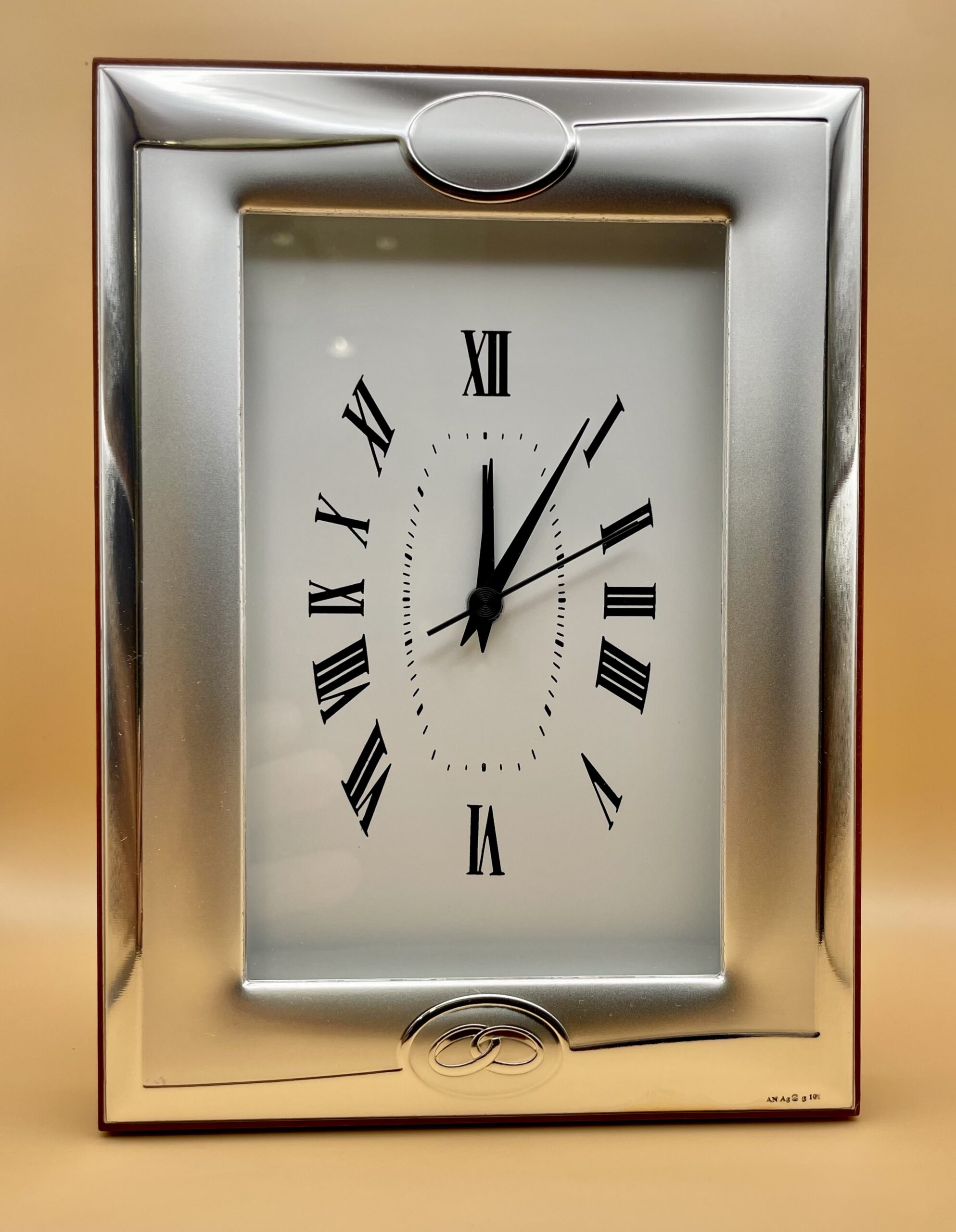 Graziosa sveglia in Argento 925, con decorazione Fedi ideale come arredamento o regalo per ricorrenza anniversari.